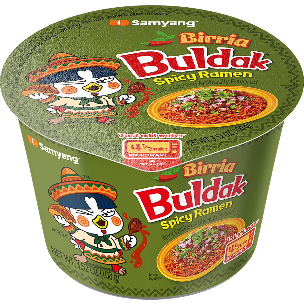 Each bite features chewy noodles coated in a smoky, chili-infused sauce packed with bold spice and savory umami. Perfectly balanced with depth and heat, it's a true adventure for spice lovers. Turn up the flavor like never before with Buldak Birria!