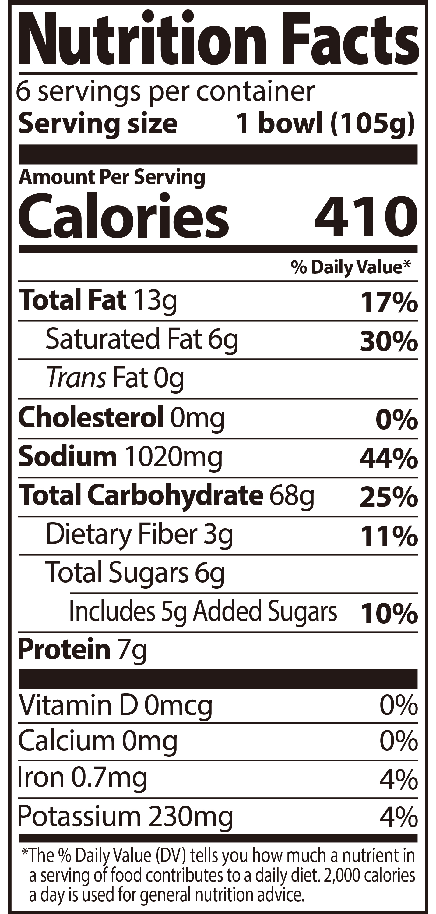 Sauce: Water, Sugar, Maltodextrin, Salt, Dextrin, Soybean Oil, Tomato Paste, Yeast Extract, Onion, Garlic, Less than 2% of Potato Modified Starch, Acid Hydrolyzed Soy, Artificial Chicken Flavor, Paprika Color, Corn Starch, Red Pepper Powder, Wheat Starch, Cumin Powder, Dextrose, Soy Protein Isolate, Soy Sauce[Water, Soybean, Salt, Wheat], Hydrolyzed Soy Protein, Capsicum Oleoresin, Rice Powder, Habanero Pepper Oleoresin, Oregano Powder, Lactic Acid, Corn Oil, Malic Acid, Ginger Oleoresin, Citric Acid, Lactic Acid Bacteria Powder